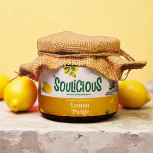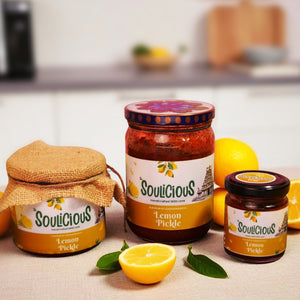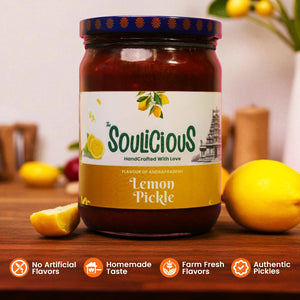 Soulicious Andhra Lemon Pickle is one which speaks in savoury. It's fiery, tangy and steeped in South Indian flavour. The sun-cured lemons are soaked till tender, then tossed with zestful red chillies and hand-pounded Andhra spices that tingle, tease, and thrill your taste buds.