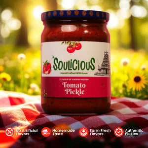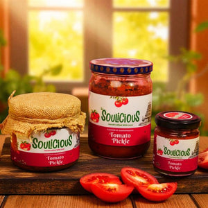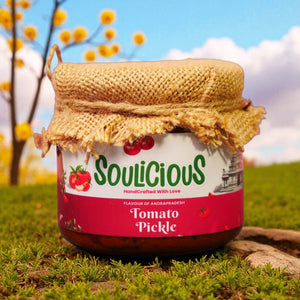 A certain zing only Andhra-style tomato pickle can bring, a tangy fire that lingers and is unapologetically fiery. Soulicious Andhra Tomato Pickle captures this bold essence with handpicked, sun-ripened tomatoes, crushed red chillies, and a roasted spice blend that’s deeply rooted in the kitchens of the South.